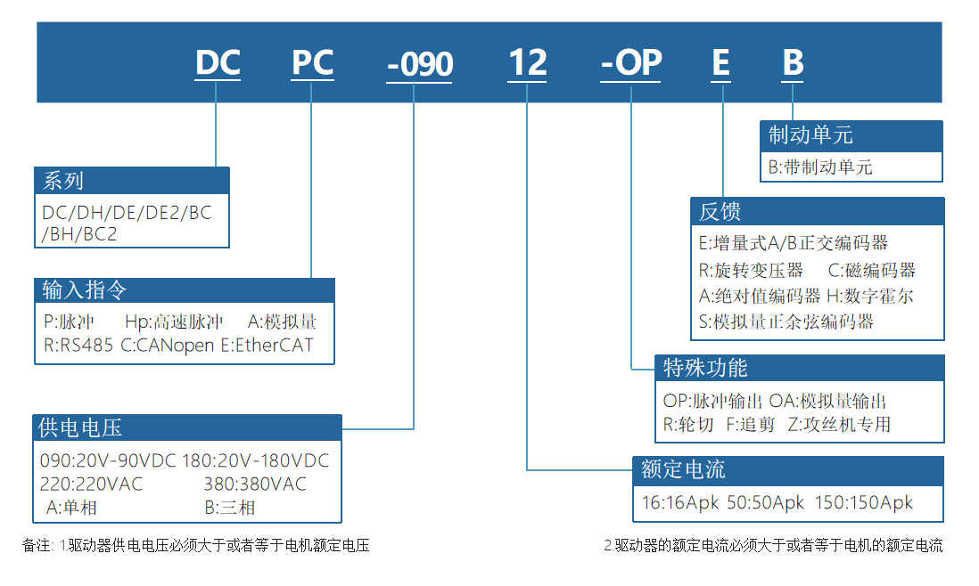 1. 系列(DC代表:直流伺服 DH:交流伺服 DE:绝对值直流伺服 DE2:直流双驱伺服 BC:直流无刷 BH:交流无刷 BC2:直流双驱无刷这七种系列)。