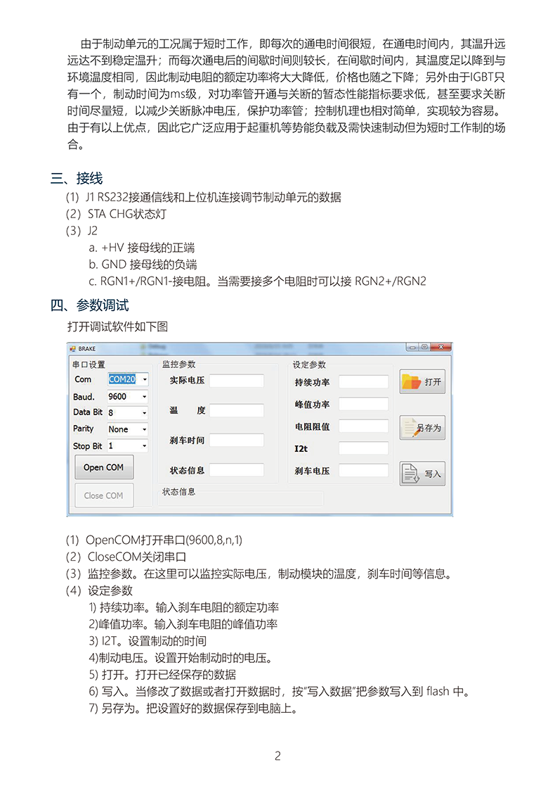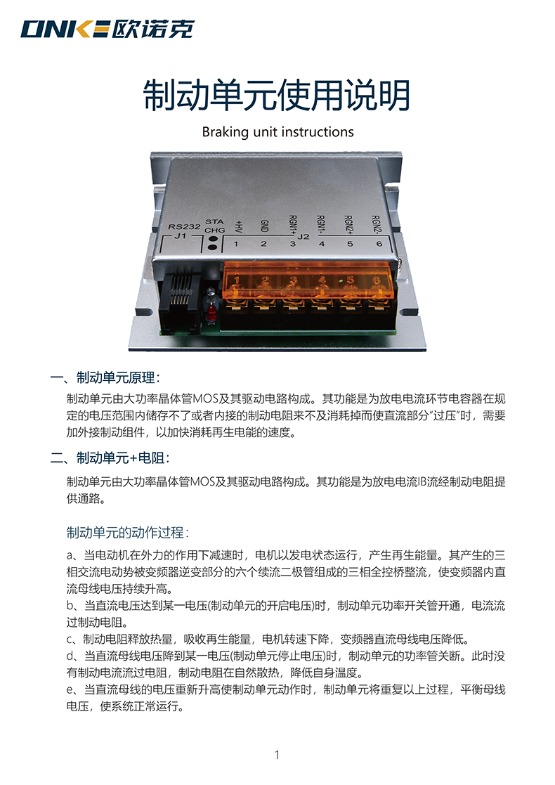 制动单元原理:制动单元由大功率晶体管MOS及其驱动电路构成。其功能是为放电电流环节电容器在规定的电压范围内储存不了或者内接的制动电阻来不及消耗掉而使直流部分“过压”时,需要加外接制动组件,以加快消耗再生电能的速度。